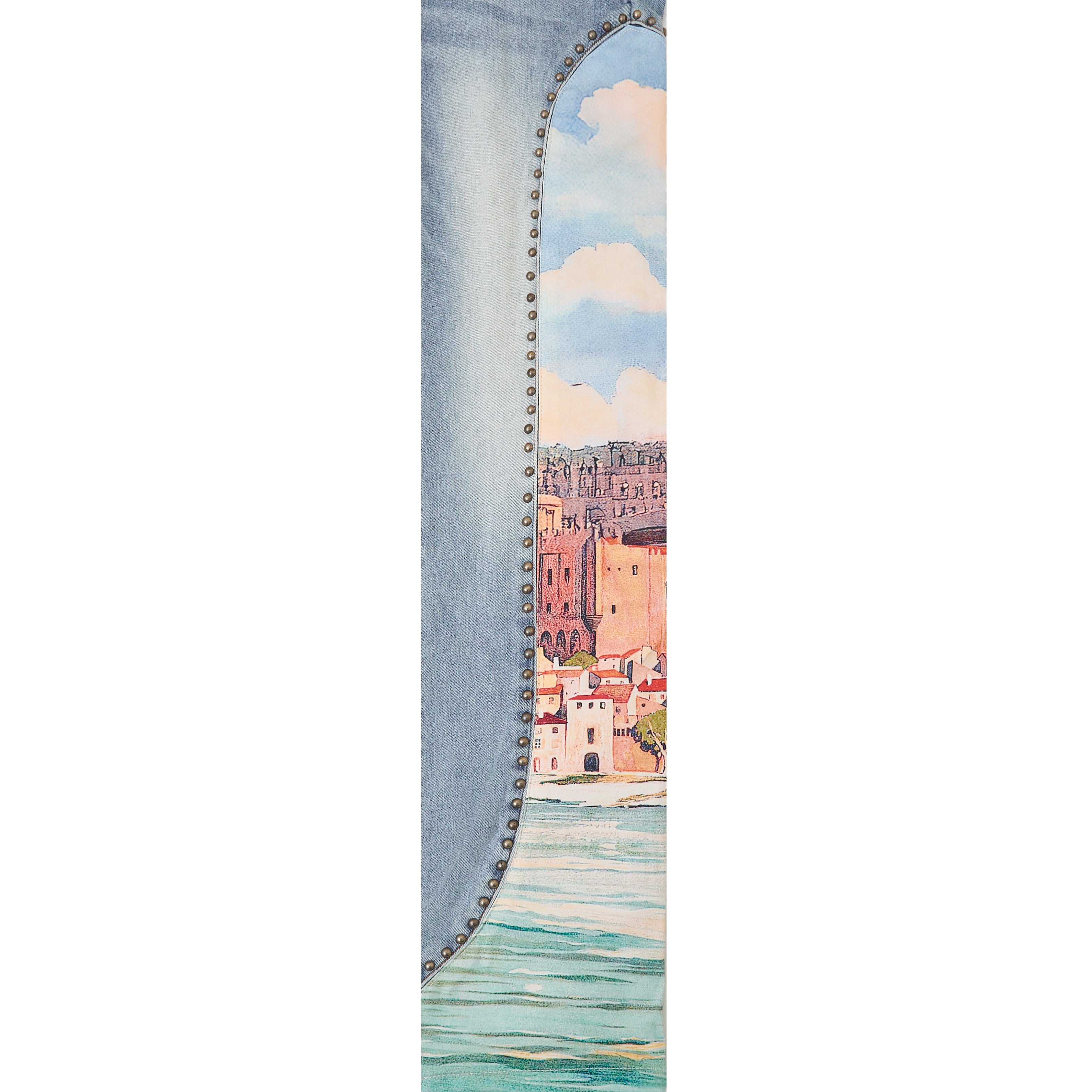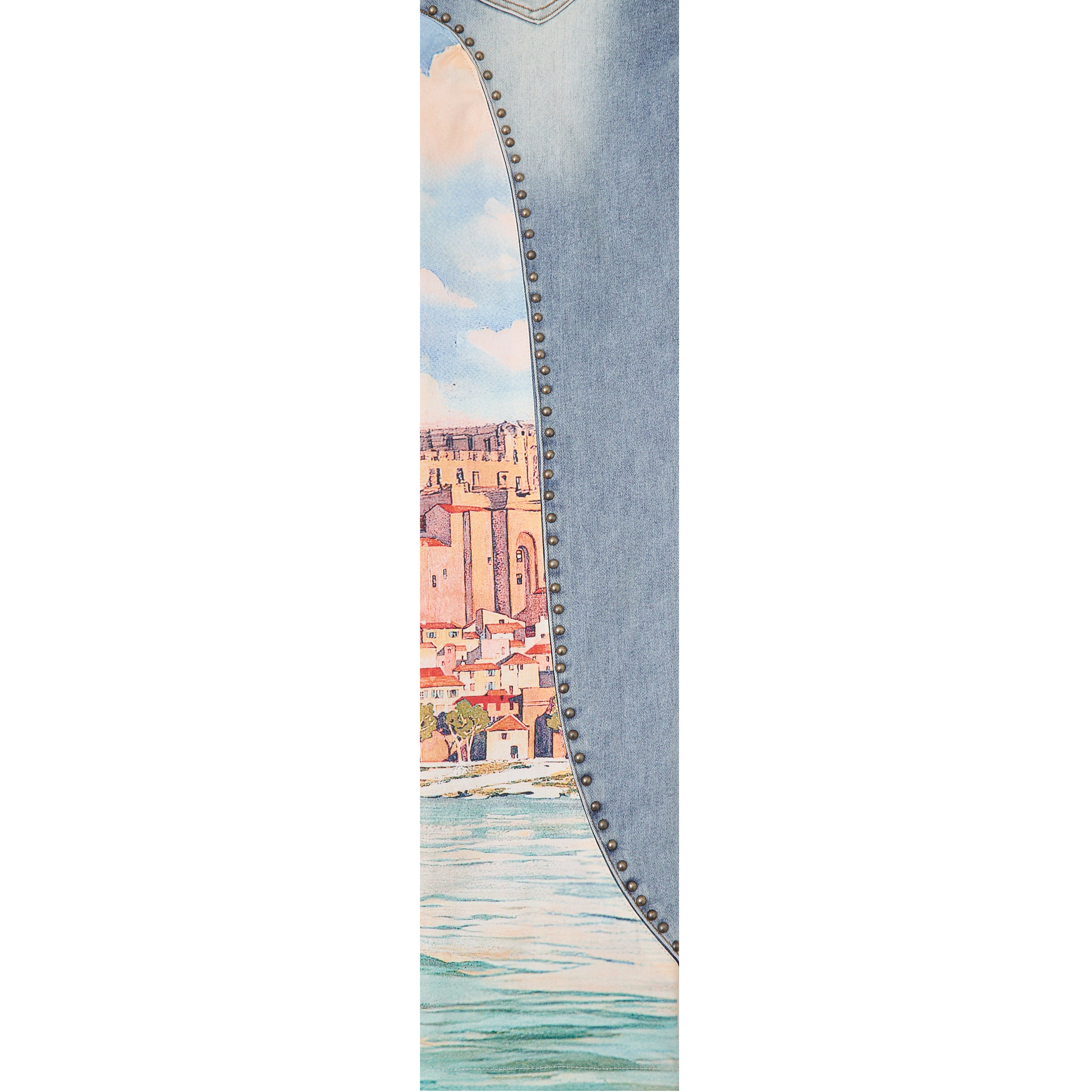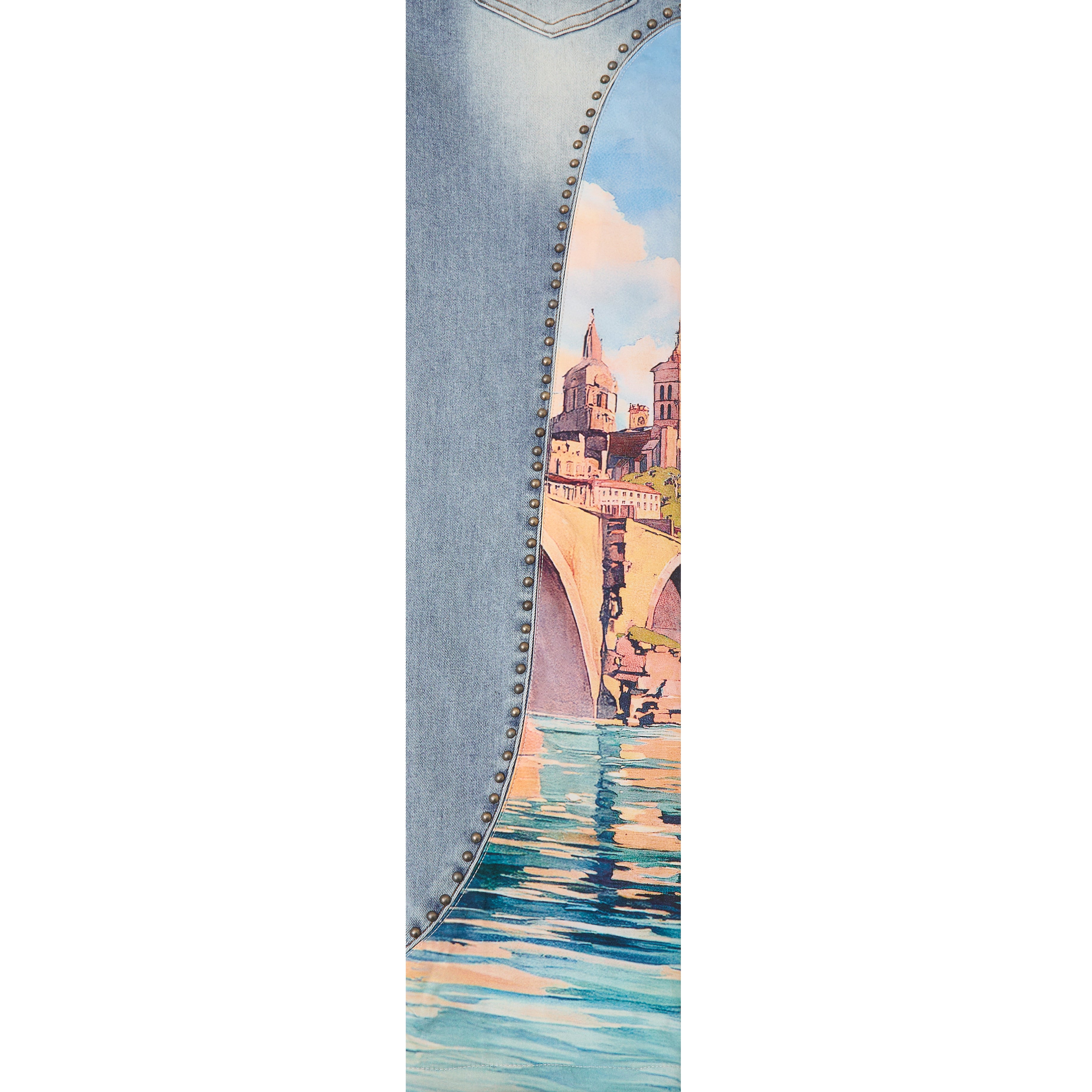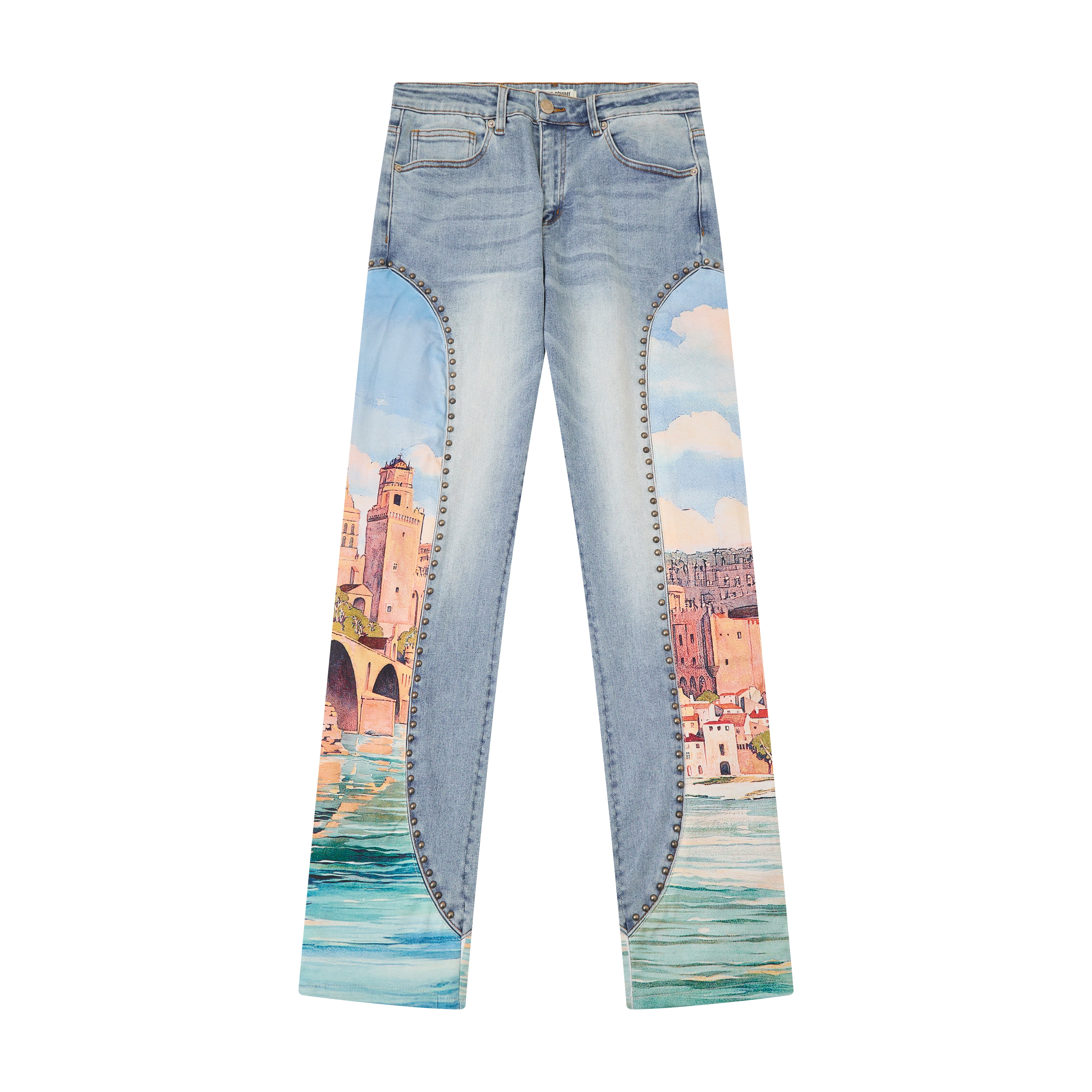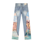 • Premium denim with an immersive landscape graphic down each leg
